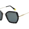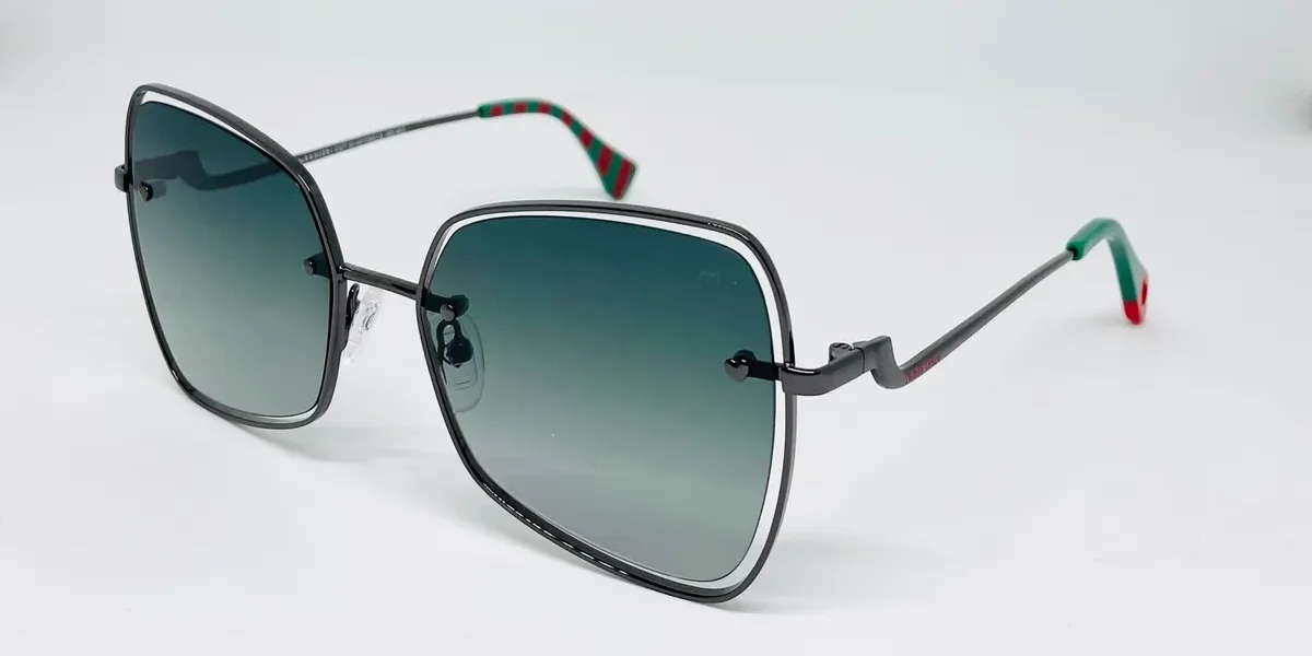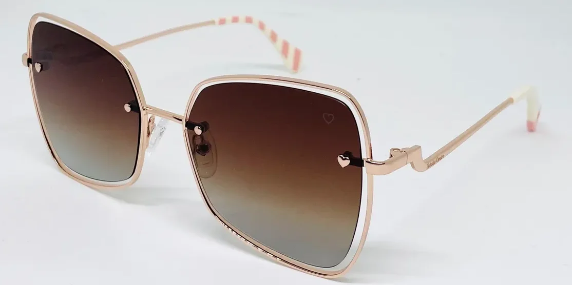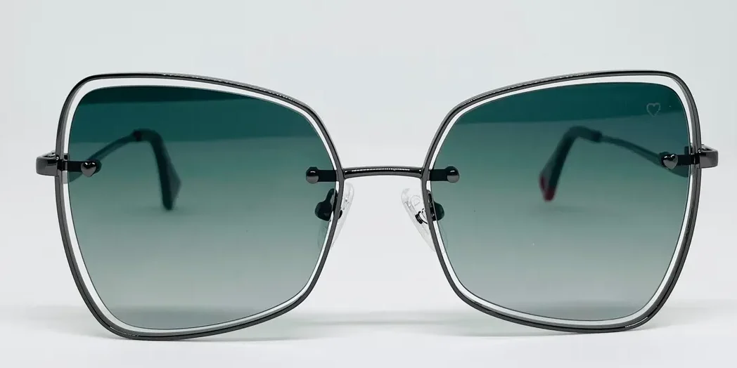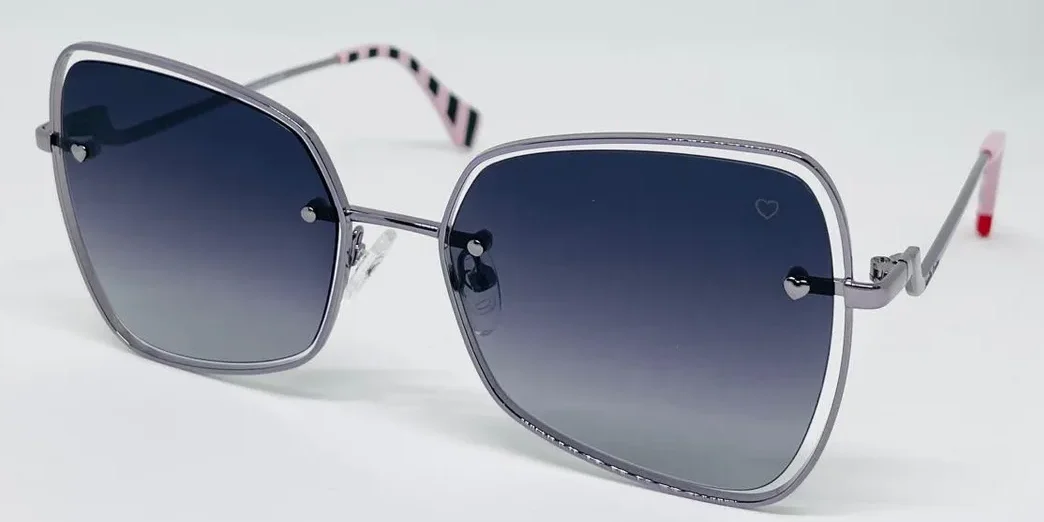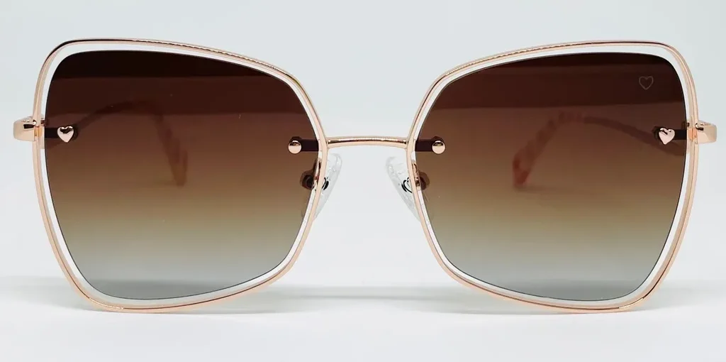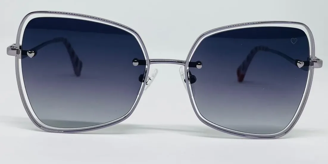 Sofisticado diseño estilo mariposa con guiños retro. Un modelo ligero y de estética contemporánea. Su frente de metal presenta lentes montadas al aire. Los talones avanzan sobre el frente con un detalle en forma de corazón. Los terminales de acetato tienen un interior estampado a rayas y un corazón calado.
