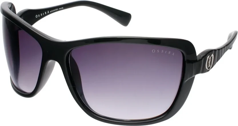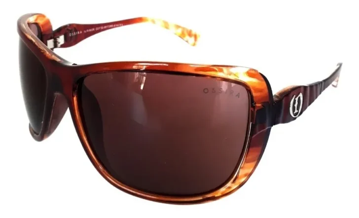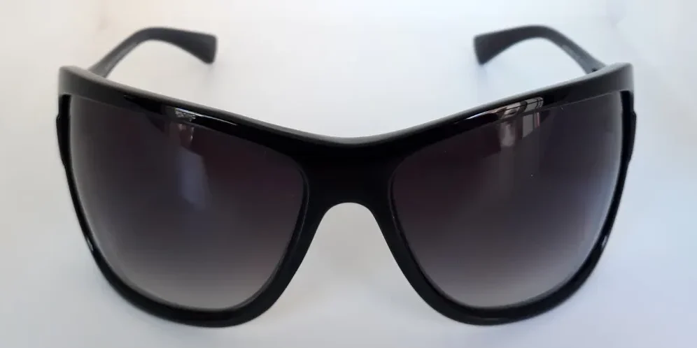 Anteojo super envolvente, de gran tamaño, realizado mediante tecnología de inyección. Importante aplique metálico sobre las patillas.
